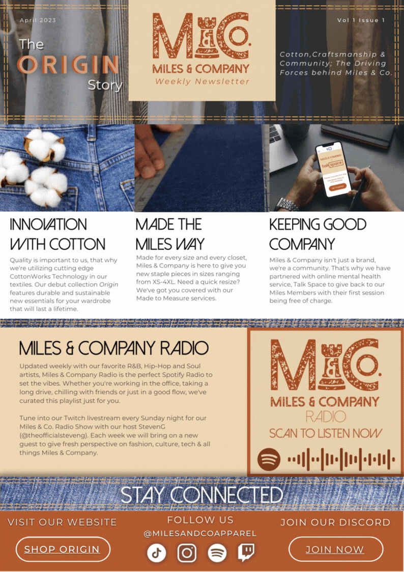 To keep our clients connected, Miles and Co. will send out weekly newsletters. The list of recipients will be obtained through a loyalty program on our website and in-store where they have the choice to opt-in or out. The newsletters will include information including trend watches, and look books to give our clients inspiration and upcoming events in the surrounding cities of the brick-and-mortar store they are clients at. Upcoming event examples would be chess tournaments, brewery tours, and concerts.